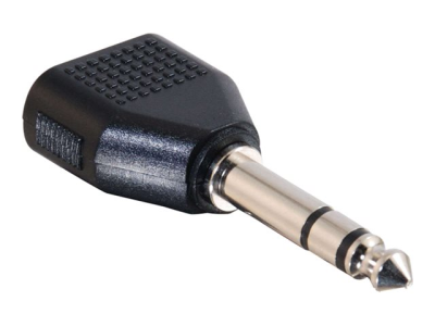 Dual stereo adapters from C2G adapt a 6.3mm stereo plug to two 3.5mm stereo jacks. It allows two 3.5mm stereo headphones to be plugged into the same 6.3 mm stereo output such as headphone jacks from amplifiers or educational equipment.